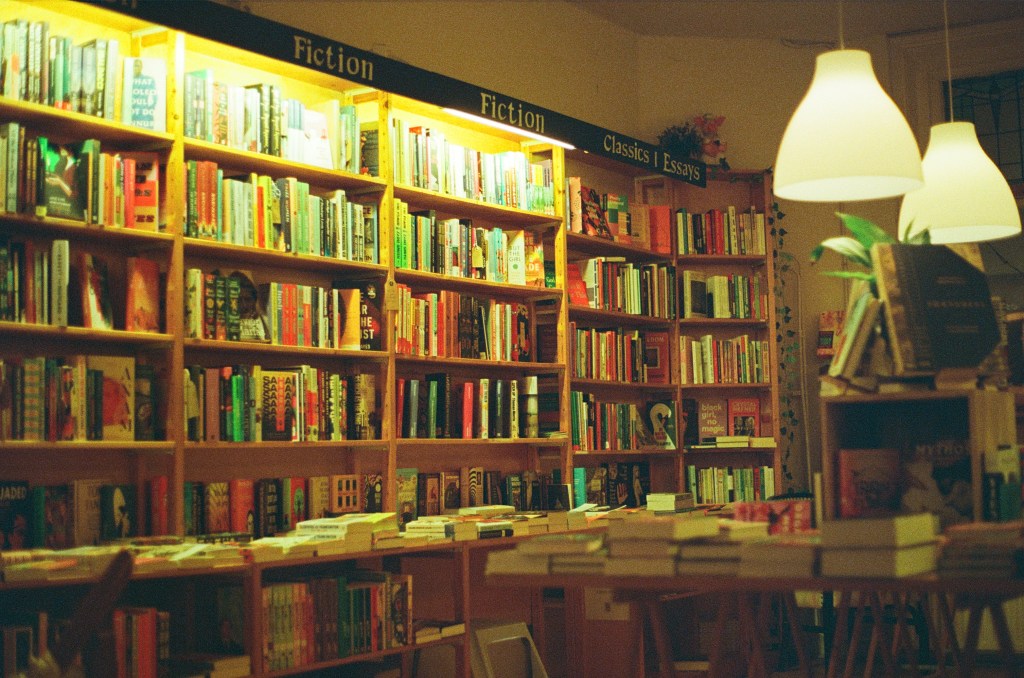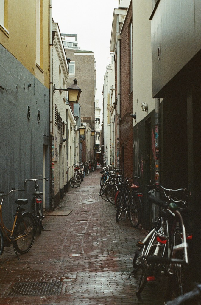 Ultimately I didn’t actually finish this first roll of film until over a year later – a marketplace addiction coupled with early-onset GAS had me buying a Ricoh XR-2 and putting a roll of colour film through that. Luckily, the Ricoh camera I’d bought was well looked after and through good luck I was saved any of the typical troubles of second-hand film cameras. I went out with this camera with the intention to get through my initial roll quickly so I could see the results; in the end my first foray into photography and first developed roll of film went well – I got all 36 exposures back near enough exposed correctly. I’ve included a few images from that first developed roll: the backstreet with bicycles, the bookshop, the double exposure with lights, and a photo of my girlfriend.